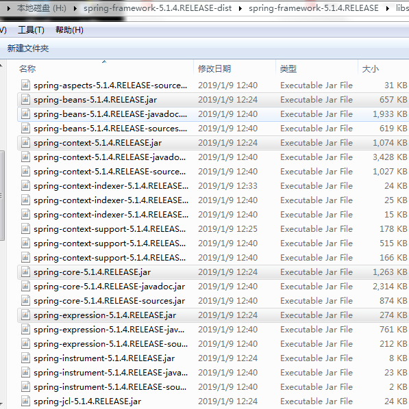 下载完成之后,我们把Spring Framework的压缩文件解压,找到libs文件夹,在里面找到4个jar包如下图所示: