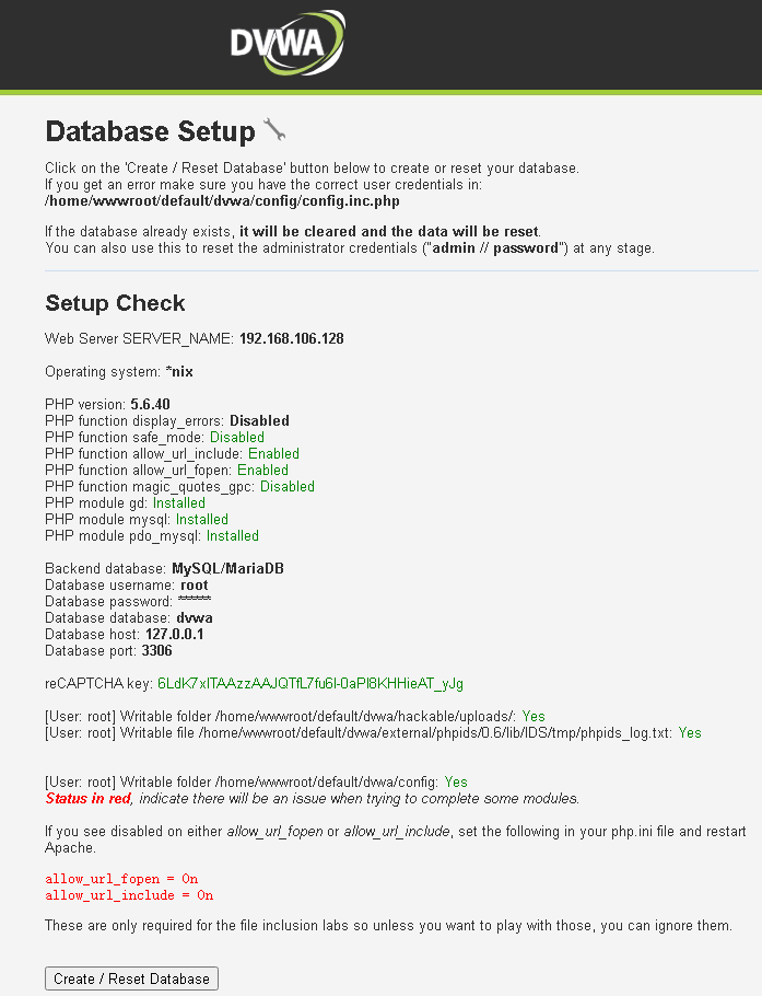 #修改完成后,访问DVWA主机,http://192.168.106.128/dvwa/setup.php,单击“Create / Restart Database”,等待即可。默认用户名和密码:admin/password