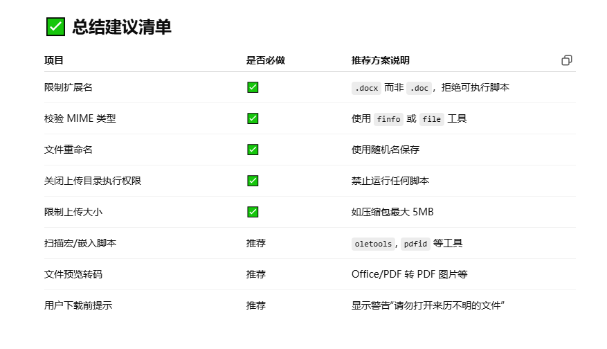 限制大小(防止 ZIP 炸弹攻击):.zip/.rar 文件设置最大解压后大小限制(后端判断),比如不超过 10MB
