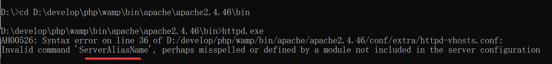 这里提示配置文件httpd-vhosts.conf里面有个SeverAliasName的无效命令,删除后重启apache即可启动成功,