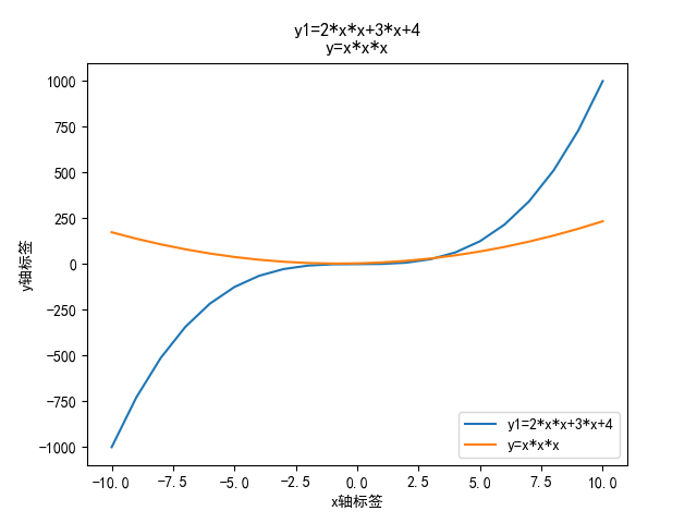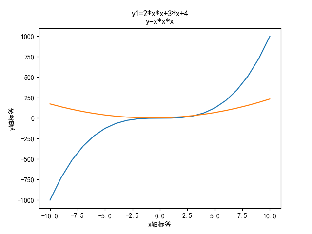 plt.title('y1=2*x*x+3*x+4\ny=x*x*x') #修改标题