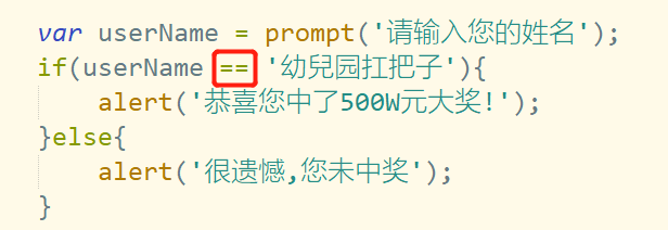 判断是否中奖:输入姓名幼兒园扛把子 则提示中奖500万元 否则提示未中奖(这里注意是 == 符号)