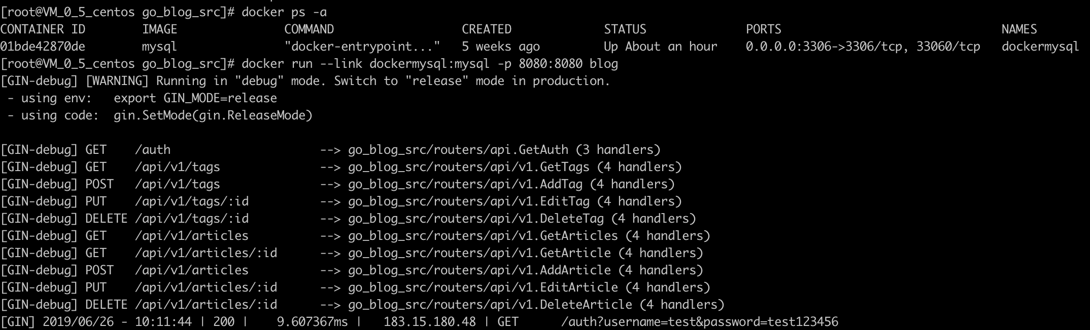 [root@VM_0_5_centos go_blog_src]# docker images REPOSITORY TAG IMAGE ID CREATED SIZE mysql latest c7109f74d339 3 weeks ago 443MB [root@VM_0_5_centos go_blog_src]# docker ps -a CONTAINER ID IMAGE COMMAND CREATED STATUS PORTS NAMES fd03062b8390 mysql "docker-entrypoint.s…" 3 days ago Up 10 minutes 0.0.0.0:3306->3306/tcp, 33060/tcp dockermysql [root@VM_0_5_centos go_blog_src]# docker build -t blog . Sending build context to Docker daemon 20.67MB Step 1/5 : FROM scratch ---> Step 2/5 : WORKDIR $GOPATH/src/go_blog_src ---> Running in 94788ca76455 Removing intermediate container 94788ca76455 ---> a3401ac5c76b Step 3/5 : COPY . $GOPATH/src/go_blog_src ---> 6aa4d7103155 Step 4/5 : EXPOSE 8080 ---> Running in 78d720992aa5 Removing intermediate container 78d720992aa5 ---> 918bd1f06448 Step 5/5 : CMD ["./main"] ---> Running in 6d67476b66d4 Removing intermediate container 6d67476b66d4 ---> a7e009d4e487 Successfully built a7e009d4e487 Successfully tagged blog:latest [root@VM_0_5_centos go_blog_src]# docker run --link dockermysql:mysql -p 8080:8080 blog [GIN-debug] [WARNING] Running in "debug" mode. Switch to "release" mode in production. - using env: export GIN_MODE=release - using code: gin.SetMode(gin.ReleaseMode) [GIN-debug] GET /export/*filepath --> github.com/gin-gonic/gin.(*RouterGroup).createStaticHandler.func1 (3 handlers) [GIN-debug] HEAD /export/*filepath --> github.com/gin-gonic/gin.(*RouterGroup).createStaticHandler.func1 (3 handlers) [GIN-debug] GET /upload/images/*filepath --> github.com/gin-gonic/gin.(*RouterGroup).createStaticHandler.func1 (3 handlers) [GIN-debug] HEAD /upload/images/*filepath --> github.com/gin-gonic/gin.(*RouterGroup).createStaticHandler.func1 (3 handlers) [GIN-debug] GET /qrcode/*filepath --> github.com/gin-gonic/gin.(*RouterGroup).createStaticHandler.func1 (3 handlers) [GIN-debug] HEAD /qrcode/*filepath --> github.com/gin-gonic/gin.(*RouterGroup).createStaticHandler.func1 (3 handlers) [GIN-debug] GET /auth --> go_blog_src/routers/api.GetAuth (3 handlers) [GIN-debug] POST /upload --> go_blog_src/routers/api.UploadImage (3 handlers) [GIN-debug] GET /api/v1/tags --> go_blog_src/routers/api/v1.GetTags (4 handlers) [GIN-debug] POST /api/v1/tags --> go_blog_src/routers/api/v1.AddTag (4 handlers) [GIN-debug] PUT /api/v1/tags/:id --> go_blog_src/routers/api/v1.EditTag (4 handlers) [GIN-debug] DELETE /api/v1/tags/:id --> go_blog_src/routers/api/v1.DeleteTag (4 handlers) [GIN-debug] POST /tags/export --> go_blog_src/routers/api/v1.ExportTag (3 handlers) [GIN-debug] POST /tags/import --> go_blog_src/routers/api/v1.ImportTag (3 handlers) [GIN-debug] GET /api/v1/articles --> go_blog_src/routers/api/v1.GetArticles (4 handlers) [GIN-debug] GET /api/v1/articles/:id --> go_blog_src/routers/api/v1.GetArticle (4 handlers) [GIN-debug] POST /api/v1/articles --> go_blog_src/routers/api/v1.AddArticle (4 handlers) [GIN-debug] PUT /api/v1/articles/:id --> go_blog_src/routers/api/v1.EditArticle (4 handlers) [GIN-debug] DELETE /api/v1/articles/:id --> go_blog_src/routers/api/v1.DeleteArticle (4 handlers) [GIN-debug] POST /api/v1/articles/poster/generate --> go_blog_src/routers/api/v1.GenerateArticlePoster (4 handlers) 2019/07/05 02:13:17 [info] start http server listening :8080 [GIN] 2019/07/05 - 02:13:22 | 200 | 19.832036ms | 183.15.181.255 | GET /auth?username=test&password=test123456