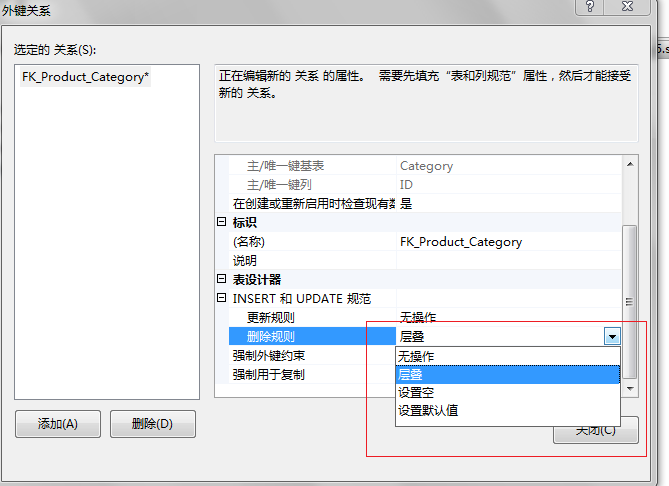 1.在vs2005中,外键约束的属性窗口中它不叫"级联",叫"层叠",估计是翻译错误.