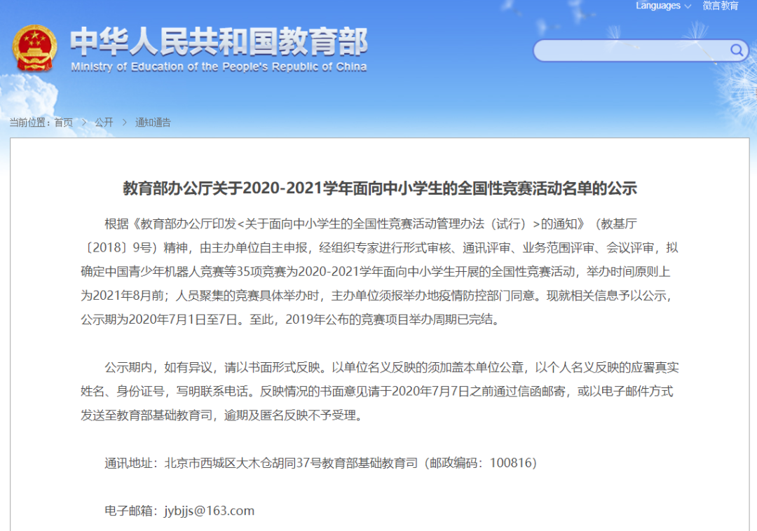 教育部公示2020-2021学年面向中小学生的全国性竞赛活动名单