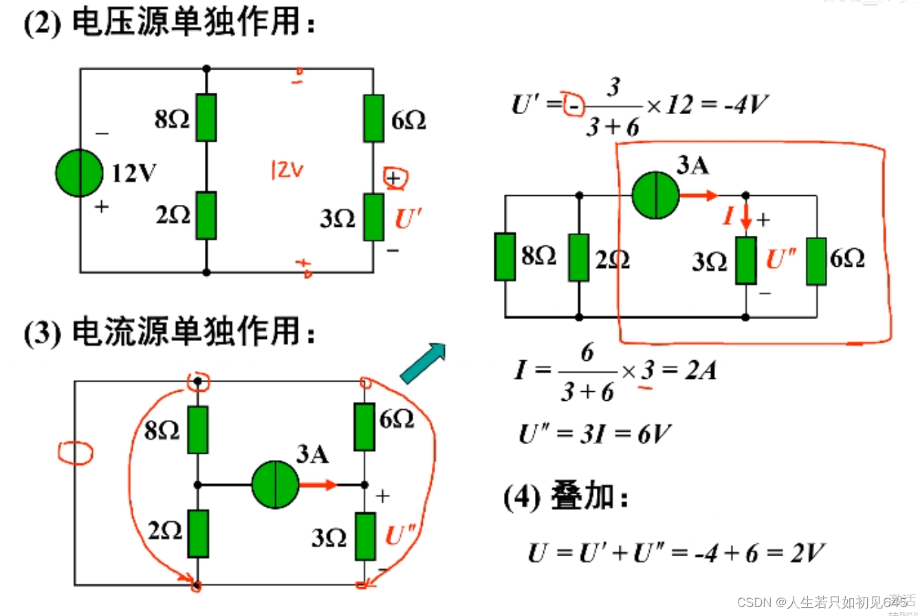 1、画出电源独立作用时的分电路图,并标上待求量的参考方向;