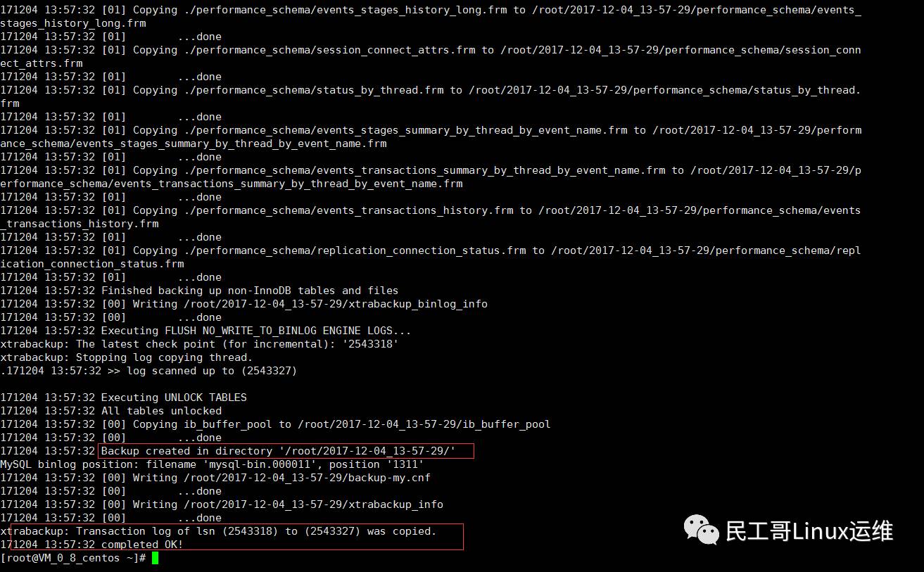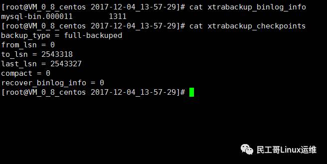 [root@Vcentos ~]# ll /backup/2017-12-05_09-27-06/ total 312 -rw-r----- 1 root root 425 Dec 5 09:27 backup-my.cnf -rw-r----- 1 root root 412 Dec 5 09:27 ib_buffer_pool -rw-r----- 1 root root 262144 Dec 5 09:27 ibdata1.delta -rw-r----- 1 root root 44 Dec 5 09:27 ibdata1.meta drwxr-x--- 2 root root 4096 Dec 5 09:27 mysql drwxr-x--- 2 root root 4096 Dec 5 09:27 performance_schema drwxr-x--- 2 root root 12288 Dec 5 09:27 sys drwxr-x--- 2 root root 4096 Dec 5 09:27 test -rw-r----- 1 root root 21 Dec 5 09:27 xtrabackup_binlog_info -rw-r----- 1 root root 117 Dec 5 09:27 xtrabackup_checkpoints -rw-r----- 1 root root 560 Dec 5 09:27 xtrabackup_info -rw-r----- 1 root root 2560 Dec 5 09:27 xtrabackup_logfile [root@centos ~]# cd /backup/2017-12-05_09-27-06/ [root@centos 2017-12-05_09-27-06]# cat xtrabackup_binlog_info mysql-bin.000001 945 [root@centos 2017-12-05_09-27-06]# cat xtrabackup_checkpoints backup_type = incremental from_lsn = 2542843 to_lsn = 2547308 last_lsn = 2547317 compact = 0 recover_binlog_info = 0