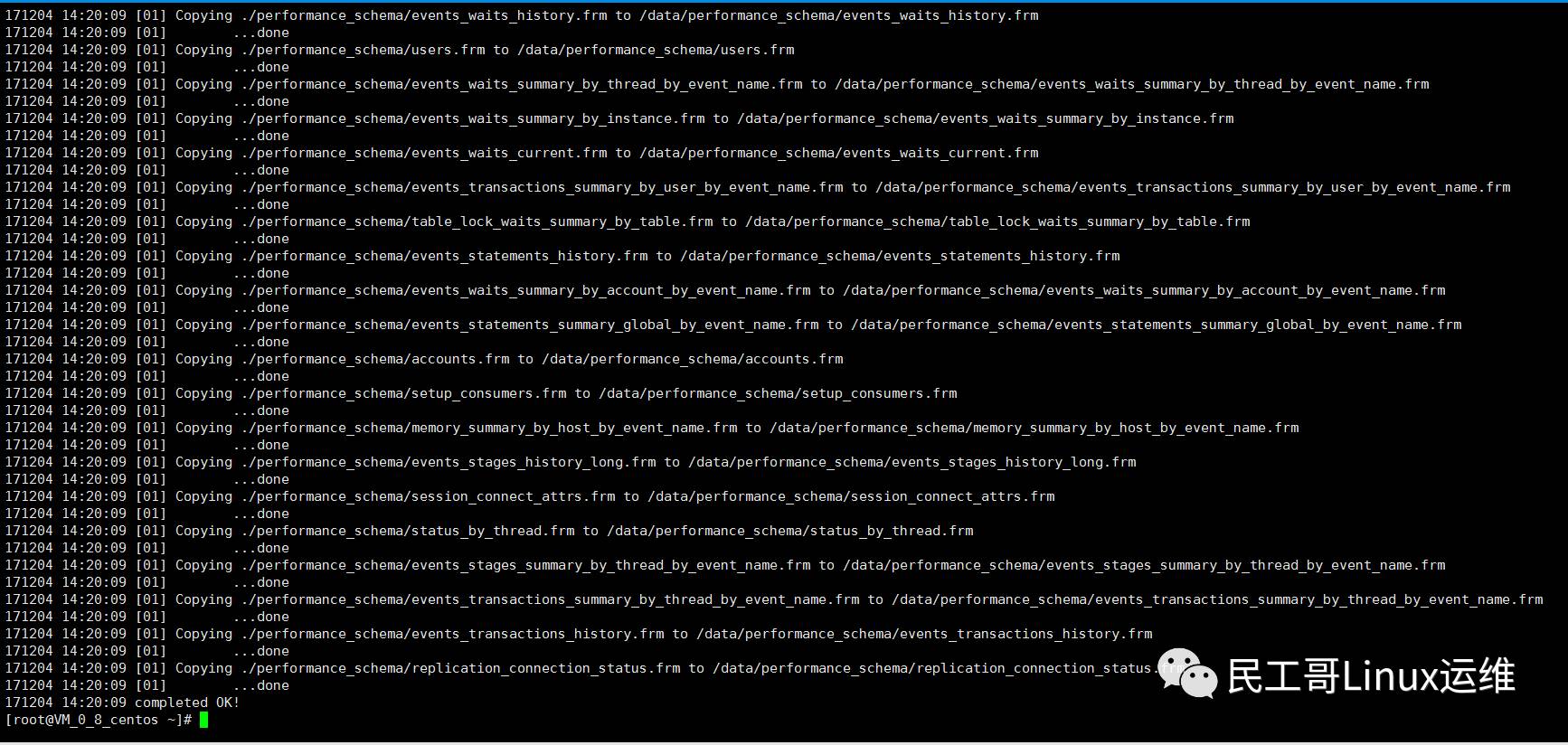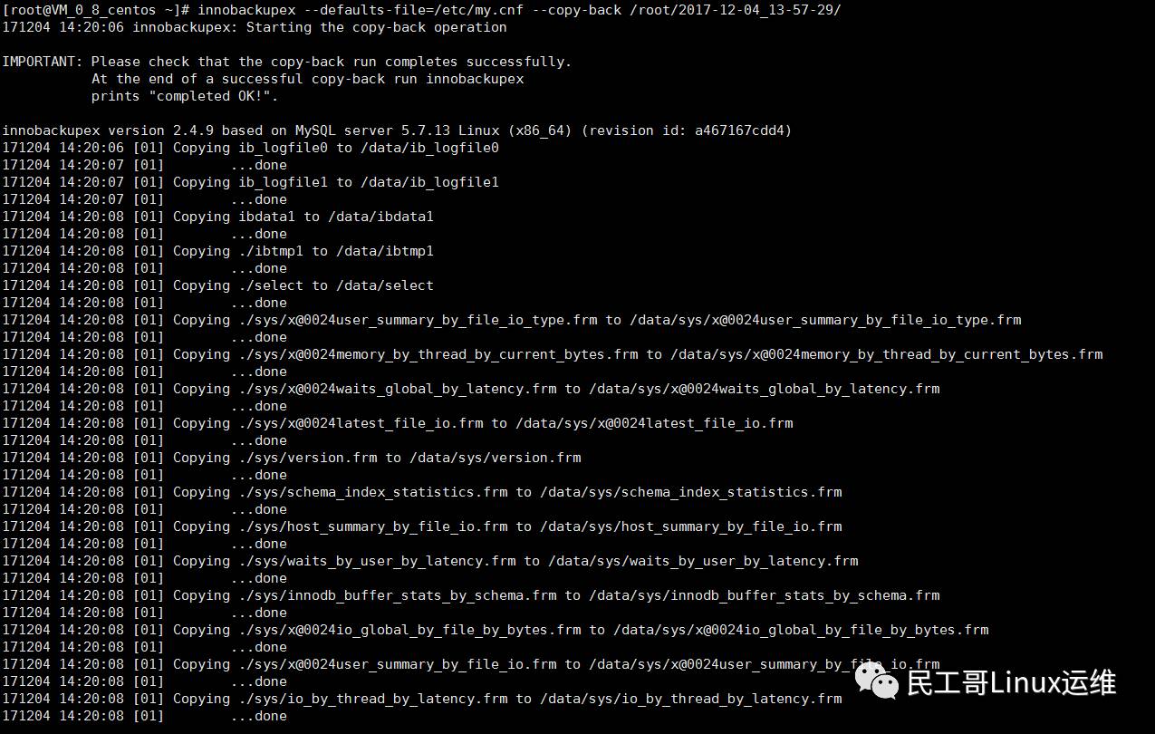 [root@centos ~]# innobackupex --defaults-file=/etc/my.cnf --copy-back /root/2017-12-04_13-57-29/