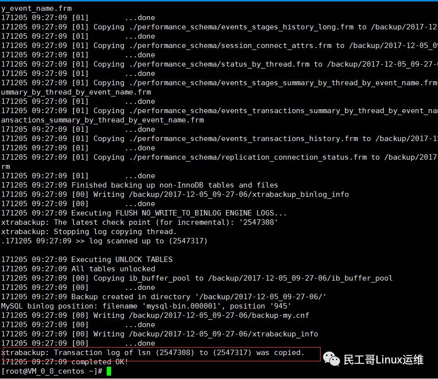 xtrabackup: Transaction log of lsn (2543172) to (2543181) was copied. 171205 10:17:52 completed OK!