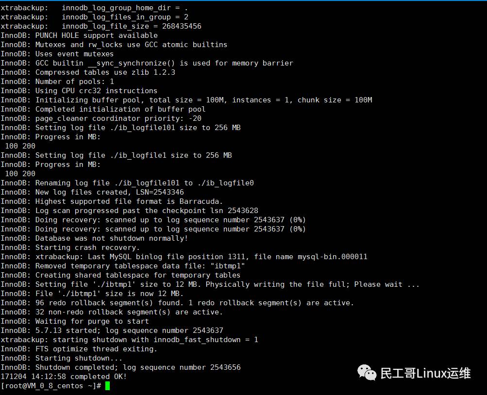 [root@centos ~]#innobackupex --apply-log /root/2017-12-04_13-57-29/