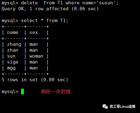 mysql> delete from T1 where name='susun'; Query OK, 1 row affected (0.06 sec)