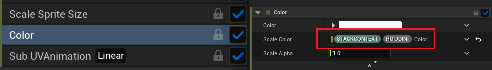 在 Niagara 中应用需要添加 Color 属性,应用 STACKCONTEXT HOUDINI Color。