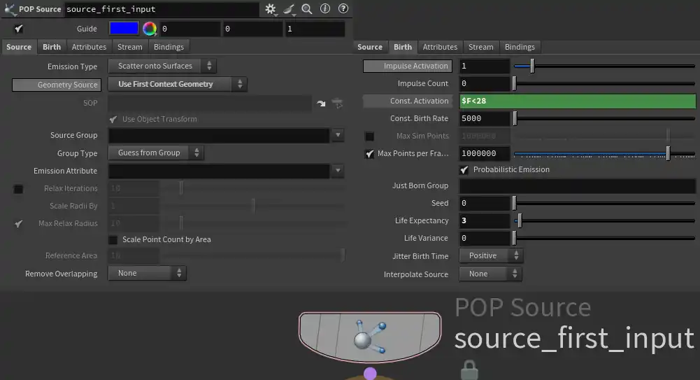 - Const. Activation | 常量激活:是否开启发射;为“0”时开启,其他值时关闭。这里在 28 帧前都开启。