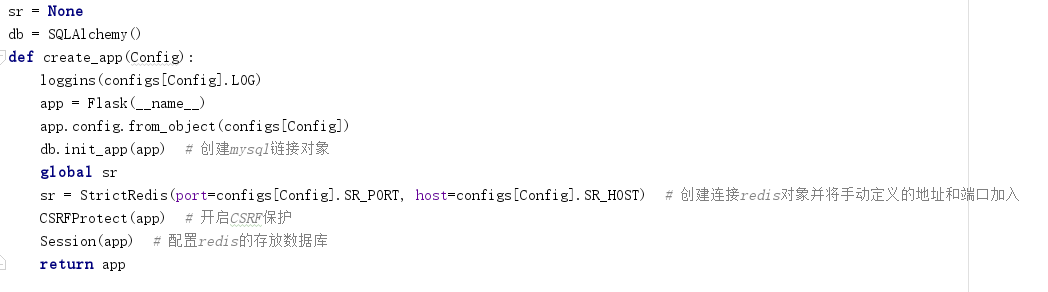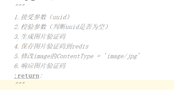 1 from . import blue_passport 2 from flask import request,abort,make_response 3 from info.utils.captcha.captcha import captcha 4 from info import sr,constants 5 @blue_passport.route("/image_code") 6 def image_code(): 7 # 1.接受参数(uuid) 8 imageCodeUUID = request.args.get("imageCodeId") 9 # 2.校验参数(判断uuid是否为空) 10 if not imageCodeUUID: 11 return abort(403) 12 # 3.生成图片验证码 13 name,imageCodeText,imageCodeIMAGE = captcha.generate_captcha() 14 # 4.保存图片验证码到redis 15 try: 16 sr.set("imageCode:"+imageCodeUUID,imageCodeText,ex=constants.IMAGE_CODE_REDIS_EXPIRES) 17 except: 18 return abort(500) 19 # 5.修改image的ContentType = 'image/jpg' 20 response = make_response(imageCodeIMAGE) 21 response.headers["Content-Type"] = 'image/jpg' 22 # 6.响应图片验证码 23 return response