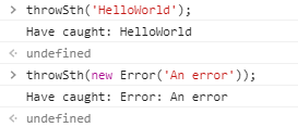 1 function throwSth(sth){ 2 try{ 3 throw sth; //这里throw出去的东西将会被catch接收到 4 } catch(err){ 5 console.log('Have caught: ' + err); 6 } 7 } 8 9 throwSth(3); // -> Have caught: 3 10 throwSth('HelloWorld'); // -> Have caught: 'HelloWorld' 11 throwSth(new Error('An error')); // -> Have caught: Error: An error