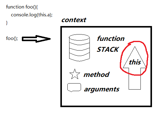 function foo(){ console.log(this.a); } var obj = { a : 2, foo : foo }; obj.foo(); // -> 2 这时foo函数的this指向obj这个对象