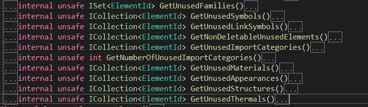 var unusedFamilyIds = method.Invoke(doc, null) as ISet<ElementId>;