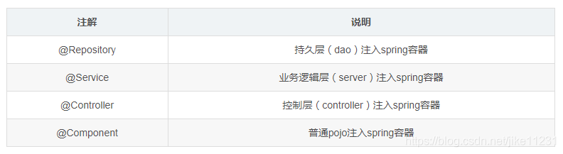 这几个注解放在一起是因为功能基本一样的,都是将类注入到spring容器中,只不过它们使用的场景不同,被@Component,@Service,@Controller,@Repository注解标注的类,这些类会被纳入进spring容器中管理。