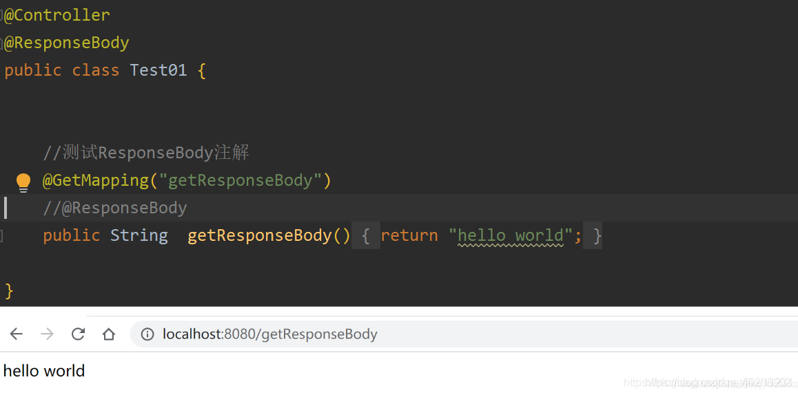 @ResponseBody可以作用在方法上或类上,表示该方法的返回结果直接写入 HTTP response body 中,而不会被解析为跳转路径,即不会经过视图解析器,返回什么数据即在页面输入什么数据。