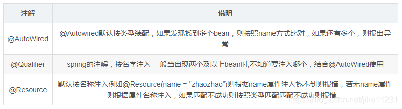 这3个注解都是基于注解方式进行自动装配,在容器里面将查找到的bean返回,一般@AutoWired用得最多,@Qualifier则需要配合@AutoWired使用,@Resource则是可以通过名字进行自动装配