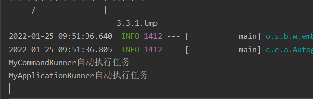 @Component @Order(0) public class MyCommandRunner implements CommandLineRunner { @Override public void run(String... args) throws Exception { System.out.println("MyCommandRunner自动执行任务"); } }