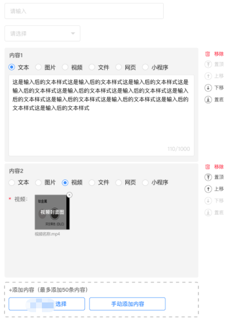 这是一个form表单,复杂的地方在于需要前端维护内容数据的上移,下移,置顶、置底、移除
