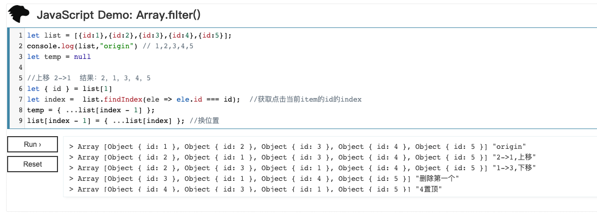> Array [Object { id: 2 }, Object { id: 1 }, Object { id: 3 }, Object { id: 4 }, Object { id: 5 }] "2->1,上移"
