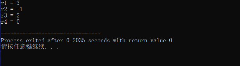 #include <stdio.h> int main() { int x, y; int r1, r2, r3, r4; x = 1; y = 2; r1 = x + y; r2 = x - y; r3 = x * y; r4 = x / y; printf("r1 = %d\n", r1); printf("r2 = %d\n", r2); printf("r3 = %d\n", r3); printf("r4 = %d\n", r4); return 0; }