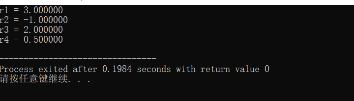 #include <stdio.h> int main() { float x, y; float r1, r2, r3, r4; x = 1; y = 2; r1 = x + y; r2 = x - y; r3 = x * y; r4 = x / y; printf("r1 = %f\n", r1); printf("r2 = %f\n", r2); printf("r3 = %f\n", r3); printf("r4 = %f\n", r4); return 0; }
