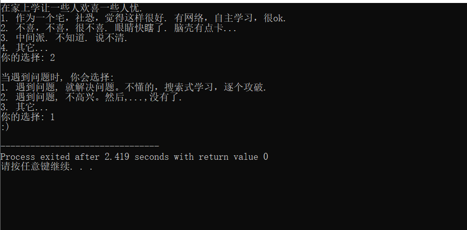 #include <stdio.h> int main() { int answer; char words[5000]; printf("在家上学让一些人欢喜一些人忧.\n"); printf("1. 作为一个宅,社恐,觉得这样很好. 有网络,自主学习,很ok.\n"); printf("2. 不喜,不喜,很不喜. 眼睛快瞎了. 脑壳有点卡...\n"); printf("3. 中间派. 不知道. 说不清.\n"); printf("4. 其它...\n"); printf("你的选择: "); scanf("%d", &answer); if(answer == 4) { printf("请补充说明你的想法: \n"); getchar(); gets(words); } printf("\n"); printf("当遇到问题时, 你会选择:\n"); printf("1. 遇到问题, 就解决问题。不懂的,搜索式学习,逐个攻破.\n"); printf("2. 遇到问题, 不高兴。然后,...,没有了.\n"); printf("3. 其它...\n"); printf("你的选择: "); scanf("%d", &answer); if(answer == 1) printf(":)\n"); else if(answer == 2) printf("这样不能解决问题啊...我们选择1好不好:)\n"); else if(answer == 3) { printf("请补充说明你的想法: \n"); getchar(); gets(words); } return 0; }