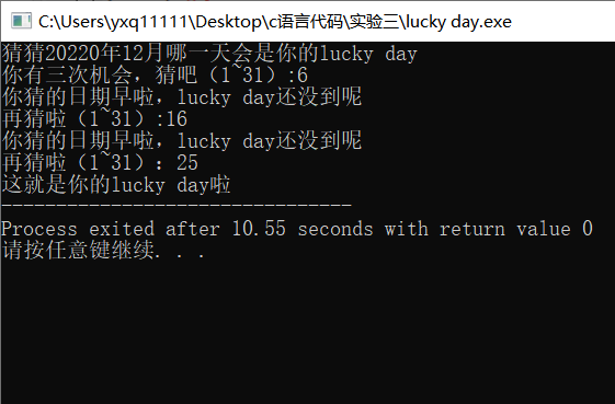 printf("次数用完啦,偷偷告诉你,你的lucky day是:%d",x);
