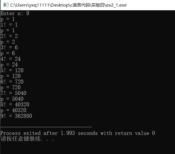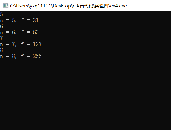 #include <stdio.h> long long fun(int n); int main() { int n; long long f; while(scanf("%d", &n) != EOF) { f = fun(n); printf("n = %d, f = %lld\n", n, f); } return 0; } long long fun(int n){ if(n==1){ return 1; } else{ return 2*fun(n-1)+1;} }