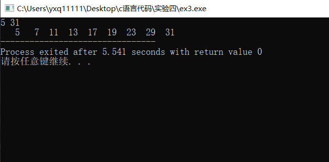 #include <stdio.h> #define N 1000 int fun(int n,int m,int bb[N]) { int i,j,k=0,flag; for(j=n;j<=m;j++) { flag=1; //1 for(i=2;i<j;i++) if(j%i==0) { //2 flag=0; break; } if(i>=j) //3 bb[k++]=j; } return k; } int main(){ int n=0,m=0,i,k,bb[N]; scanf("%d",&n); scanf("%d",&m); for(i=0;i<m-n;i++) bb[i]=0; k=fun(n,m,bb); //4 for(i=0;i<k;i++) printf("%4d",bb[i]); return 0; }