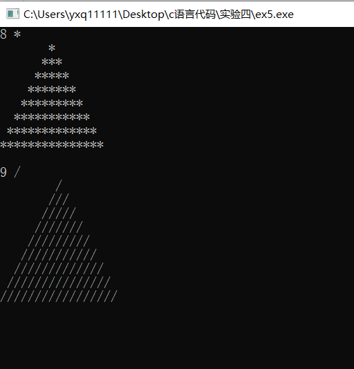 #include <stdio.h> void draw(int n, char symbol); // 函数声明 #include <stdio.h> int main() { int n, symbol; while(scanf("%d %c", &n, &symbol) != EOF) { draw(n, symbol); // 函数调用 printf("\n"); } return 0; } // 函数定义 void draw(int n,char symbol) { int line,i,j; for(line=1;line<=n;line++) { for(i=1;i<=n-line;i++) printf("%c",' '); for(i=n-line+1;i<n+line;i++) printf("%c",symbol); printf("\n"); } }