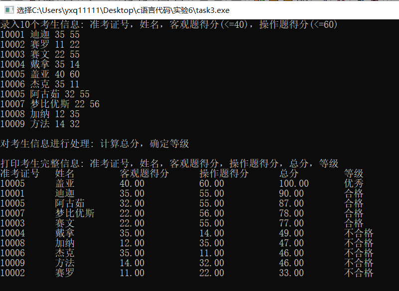 //输出考生完整信息: 准考证号,姓名,客观题得分,操作题得分,总分,等级