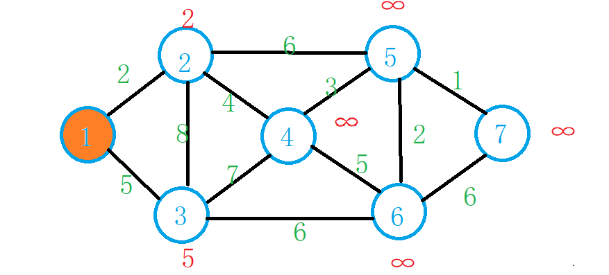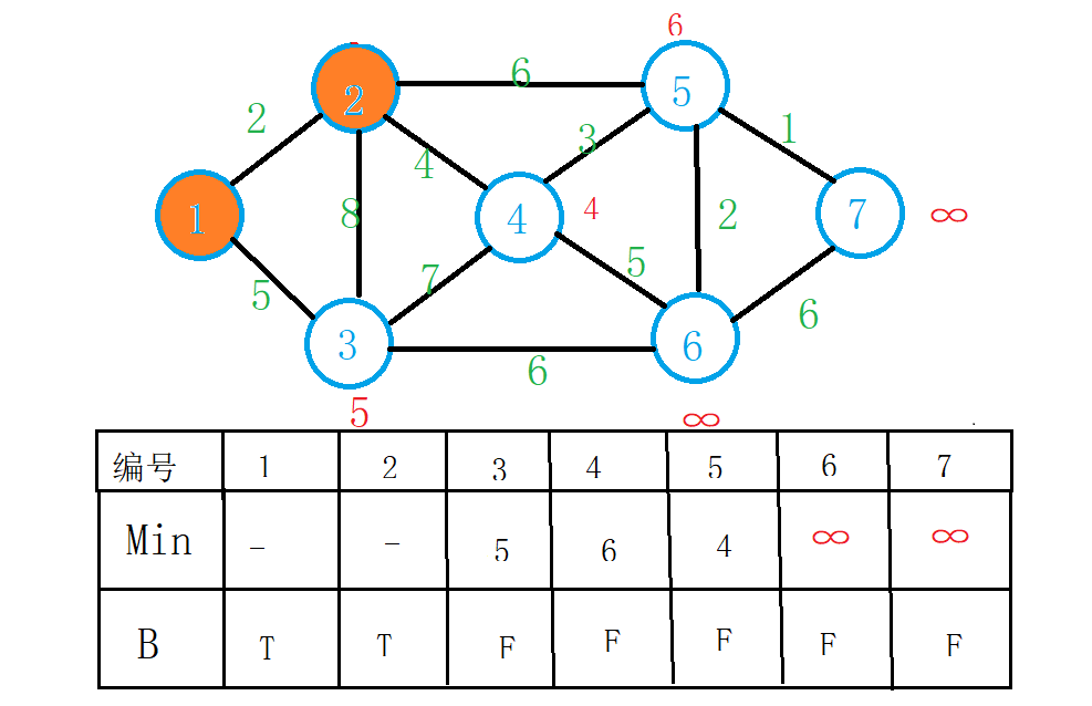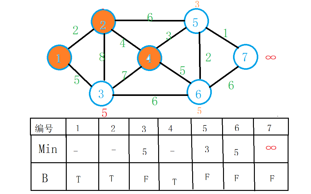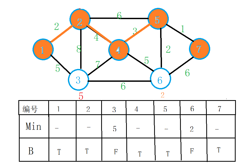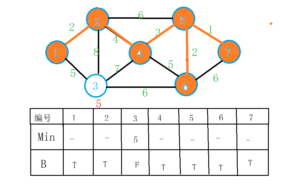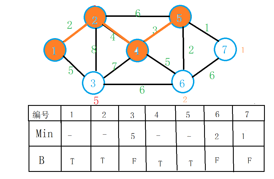 以下图中,绿色为权值,红色为结点与生成树相连的最小权值,橙色表示已选中的结点。