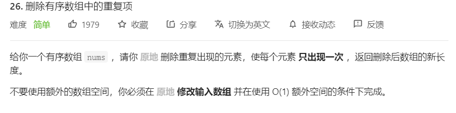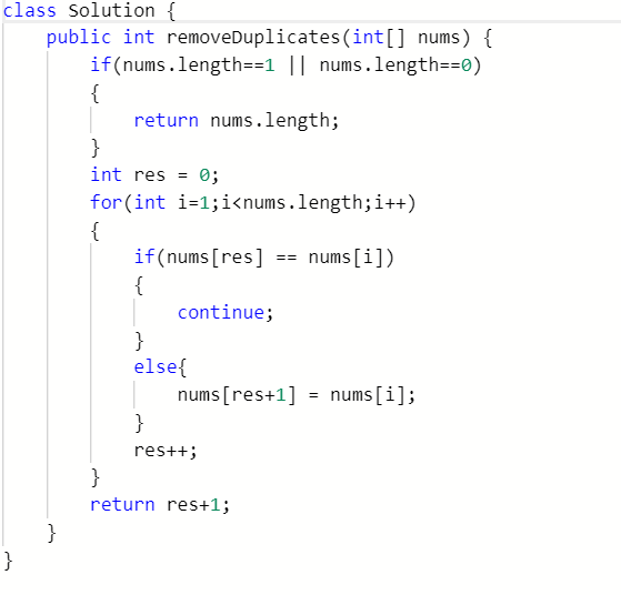 我的思路:上图中的数组【0,0,1,1,1,2,2,3,3,4】,res为返回数组的长度,初始值为0,i为数组下标,i从1开始遍历,如果下标为i的值等于下标为res的值,则继续遍历,当nums[ i ]不等于nums[ res ] 时,res的下一位等于nums[ i ],res++,继续遍历,知道遍历到最后一位,返回结果res需要加1,因为我们的初始值是从0开始的。