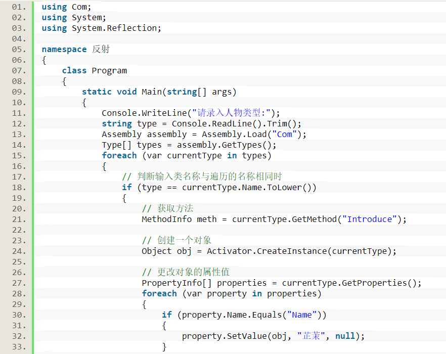试想一下,如果我们再加一个人物类别,比如新加一个类(如:校长),这个时候上面的switch case的代码会相应的发生增加一个case, 这样就不利于维护,如果能够在增加类的时候不对原来的主要程序不做更改,这个时候反射就是一种很好的解决方案。