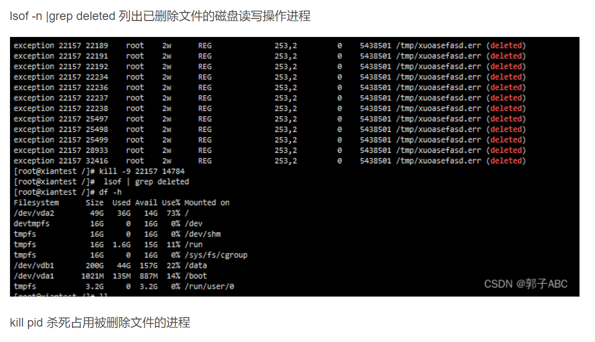 linux磁盘空间已满,手动rm -rf 删除了大文件之后,df -h 查看一下发现空间占用还是不变,有时候会想rm -rf 删除只是逻辑删除到回收站一样?其实不然,通常这种情况都是文件被删除,但是还被进程占用,因此删除文件空间未释放
