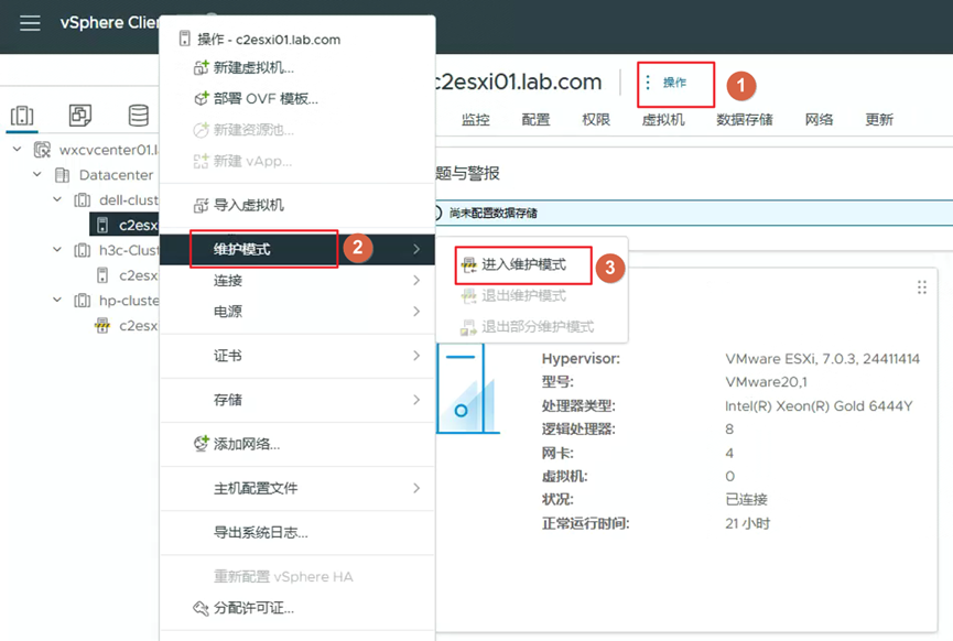 1、在升级之前把虚拟机迁移至集群内的其他主机,并把主机进入维护模式