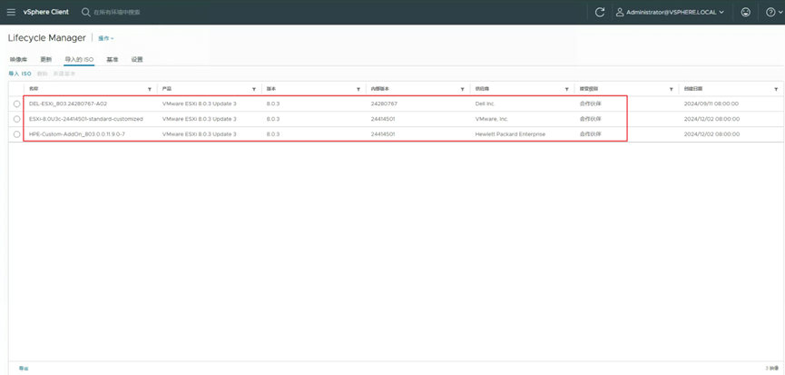 6、导入后如下图所示(我这里演示导入了3个OEM的镜像,根据你的ESXI主机厂商下载导入即可)