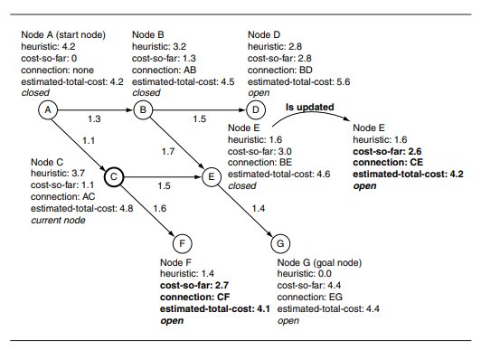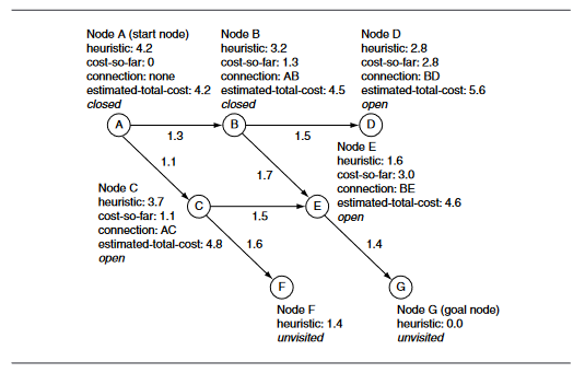 在迭代期间,A星算法会考虑从当前节点发出的每个连接,计算到达终端节点的总成本以及终端节点所拥有的连接。此外,每个终端节点都会存储一个此节点到目标节点的路径总成本的估计值,可称为估计总成本。该估计总成本通常由目前的成本和到目标点的距离组成。这些估计值被称作该节点的启发式值,且该值是非负的。