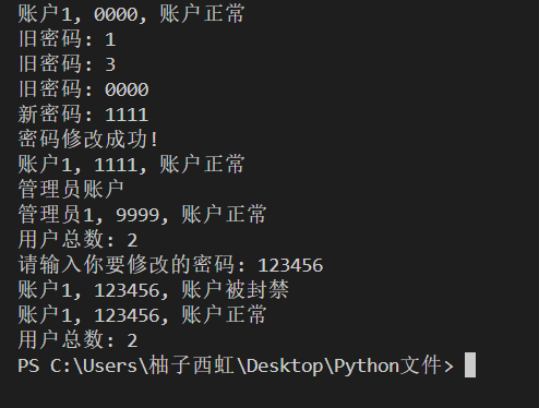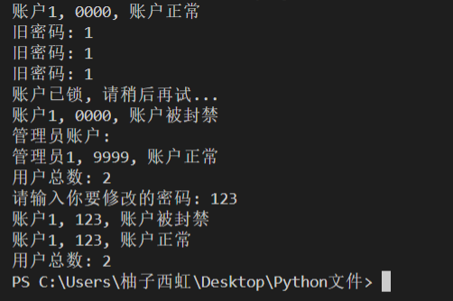 1 from user import User, Admin 2 3 u1 = User('账户1', '0000', '1') 4 u1.info() 5 u1.modify_password() 6 u1.info() 7 8 admin1 = Admin('管理员1', '9999', '1') 9 admin1.info() 10 User.show_count() 11 12 admin1.reset_password(u1) 13 admin1.ban_user(u1) 14 u1.info() 15 admin1.unlock_user(u1) 16 u1.info() 17 User.show_count()