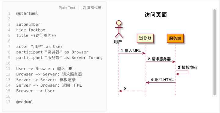 如下图,一个简单的示例,一句 User -> Browser 就能表达一个时序,多么直观简洁啊。
