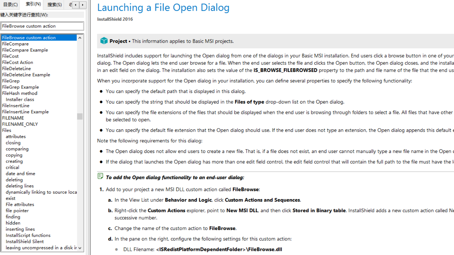 1. 参考Help Library(关键字:FileBrowse custom action),仅试用于 Basic MSI project