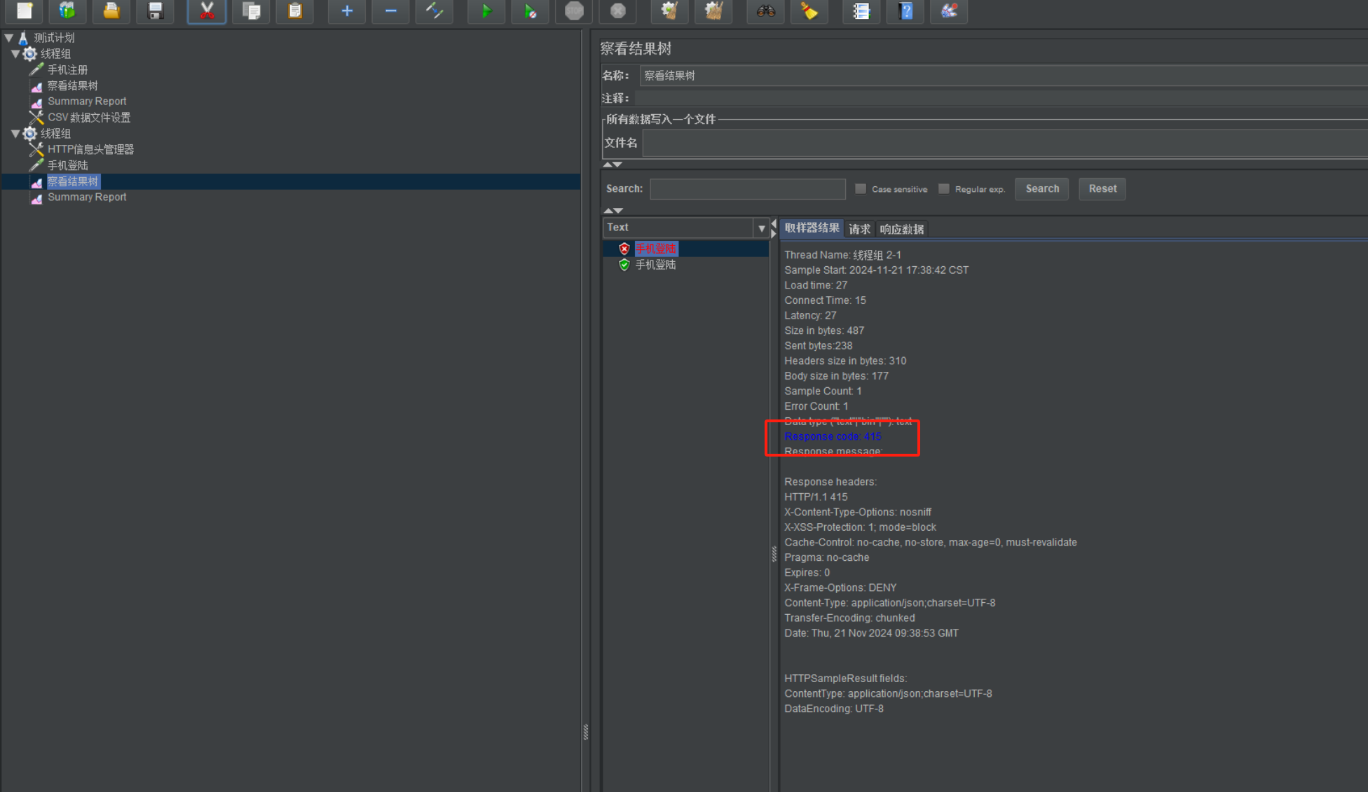 当接口请求头中的 Content-Type 值是 application/json时,必须要添加【http信息头管理器】,将 Content-Type 的值添加进去(否则可能报415)