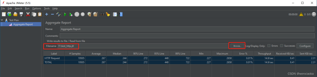 命令行执行后,每隔30秒会打印出30秒内的运行情况和运行至今的运行情况,找到日志文件,打开JMeter客户端,添加Aggregate Report,导入日志文件,可以查看执行结果: