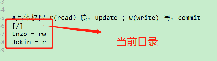 ③app/shop/conf/authz 文件中设置权限 =》①[/] ②Enzo = rw ③Jokin = r #①具体仓库,②读写权限