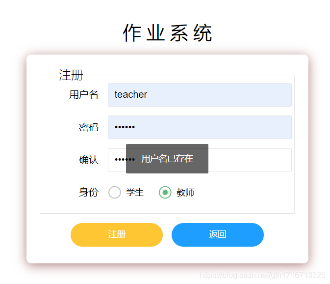 如果用户没有输入用户名、密码,或没有选择身份,就会注册失败,并提示用户进行完整输入。