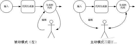 在技术领域一般我们可以将代码生成技术分为两大类:被动模式和主动模式(见图2)。在被动模式下,代码生成器产生一系列的代码,然后软件开发者可以自由的修改、编辑这些代码,但代码生成器不再承担对代码的维护工作。大多数软件集成开发环境(IDE)中的应用“向导”就是这种类型的代码生成器。被动模式的代码生成技术有其应用的范围,但是被动模式的生成系统有天生的局限性。生成器只运行一次,然后就不再承担对代码的维护工作。与此相反,主动模式下的代码生成器则对生成的代码“长期”负责,可以通过改变生成器的输入参数并重新运行生成器来改变输出的代码。如编译器生成器就是一种主动模式的代码生成器。